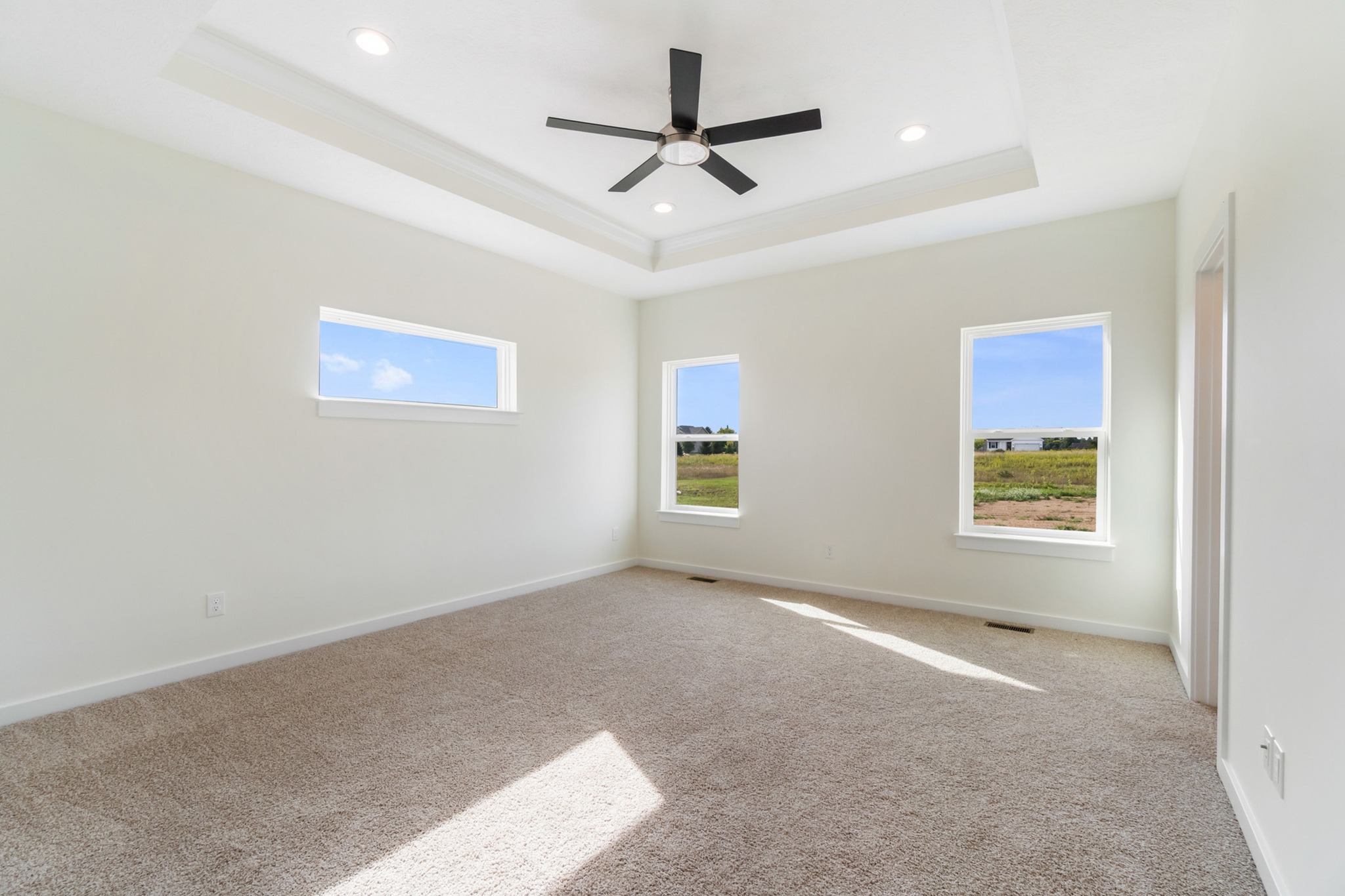 The primary suite is a private retreat, also showcasing a tray ceiling, recessed lighting, ceiling fan, a walk-in closet, and an ensuite bath.